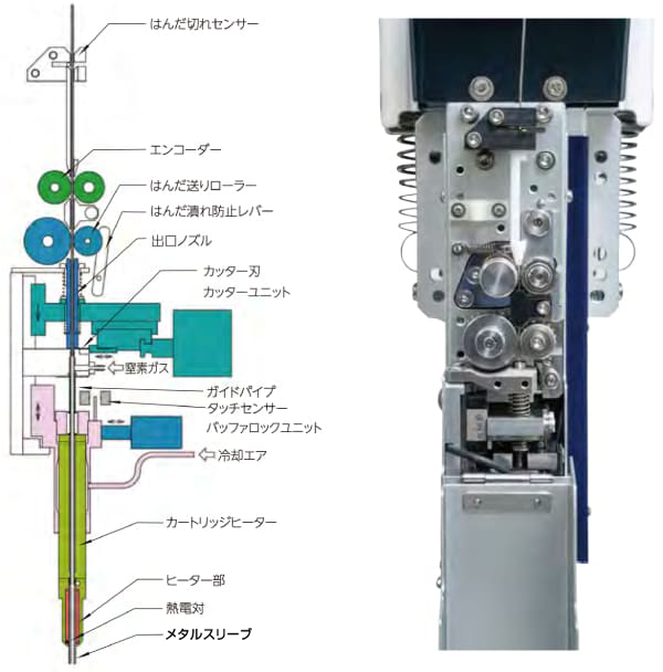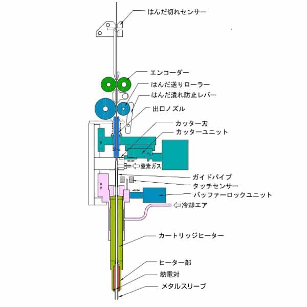 窒素ガスはヒーター内部からメタルスリーブ内部を通り、メタルスリーブ先 端から排出されるため、窒素雰囲気でのはんだ付けはもとよ り、予熱効果も生まれ、良好なはんだ付けを実現します。